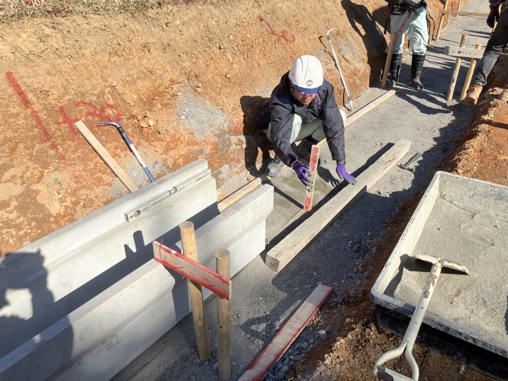 若い従業員さんたちで側溝の据付作業を行なっております。